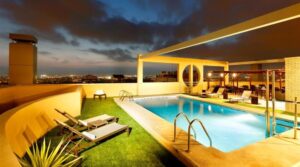 Modern hotel, ten noorden van de Jardin de Turia, bij de las Cortes Valencianas, vlakbij het moderne shoppinggebied. Mooi dakterras met buiten zwembad en prachtig uitzicht over de stad.